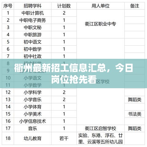 随着经济的持续发展,衢州地区的企业和行业在不断地壮大和扩张,对于人才的需求也日益增加,本文将为您详细介绍衢州今日招工的最新信息,带您了解当地的就业市场。