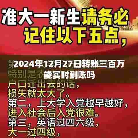 对于2024年12月27日转账三百万能否实时到账的问题,我们可以从以下几个方面进行分析: